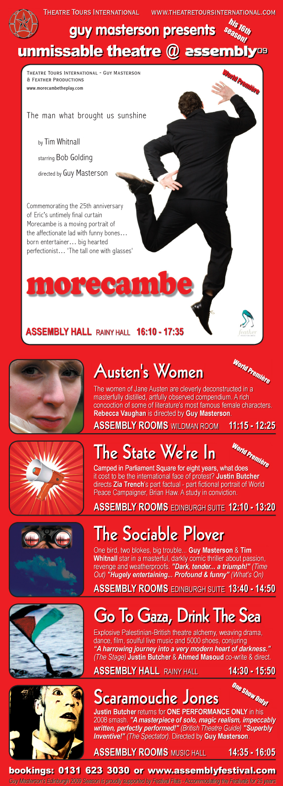 Edinburgh 2009 was a fabulous year. As in 2007 we presented 3 World Premieres, 2 Edinburgh Premieres and 1 revival. Guy Masterson directed 2 of the world premieres (Austen's Women and Morecambe) and also appeared in Tim Whitnall's dark comedy The Sociable Plover alongside Ronnie Toms - while Tim also wrote Morecambe. Justin Butcher returned for a gala performance of his 2008 smash hit Scaramouche Jones in Assembly's magnificent Music Hall and he also directed the World Premieres of Zia Trench's political work The State We're In - about Brian Haw; and his own reflections on the current issues in Palestine - Go To Gaza, Drink The Sea...