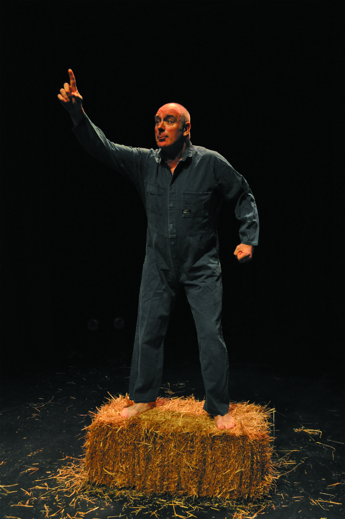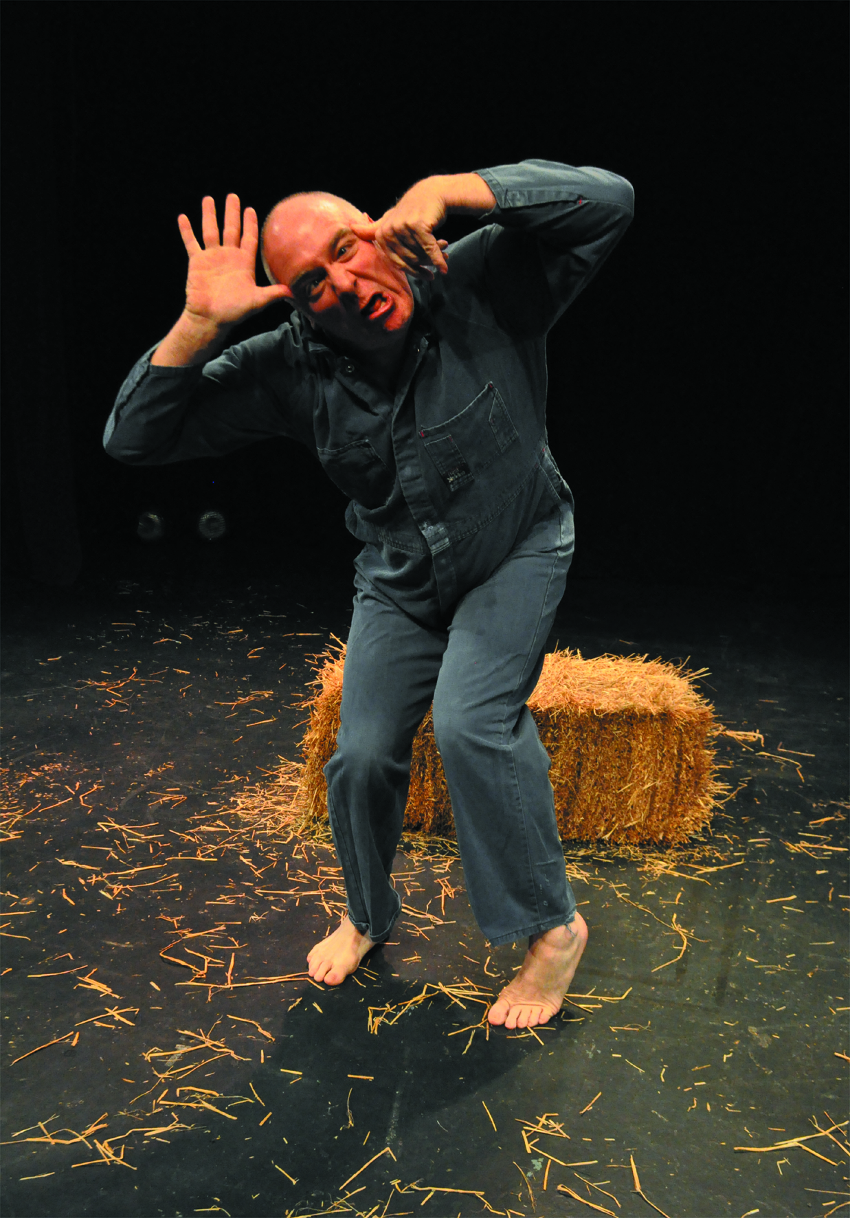 Masterson's set couldn-t be more simple - a bale of hay centre stage. His costume is just as simple - a pair of blue overalls (soaked in sweat by the end of the performance). The lighting and sound effects are also simple. But what isn't simple is Masterson's interpretation. It-s engaging and dynamic for the full 95 minutes he's on stage. He brings out the humour of the piece and introduces minor updates to add to the relevance for a contemporary audience.