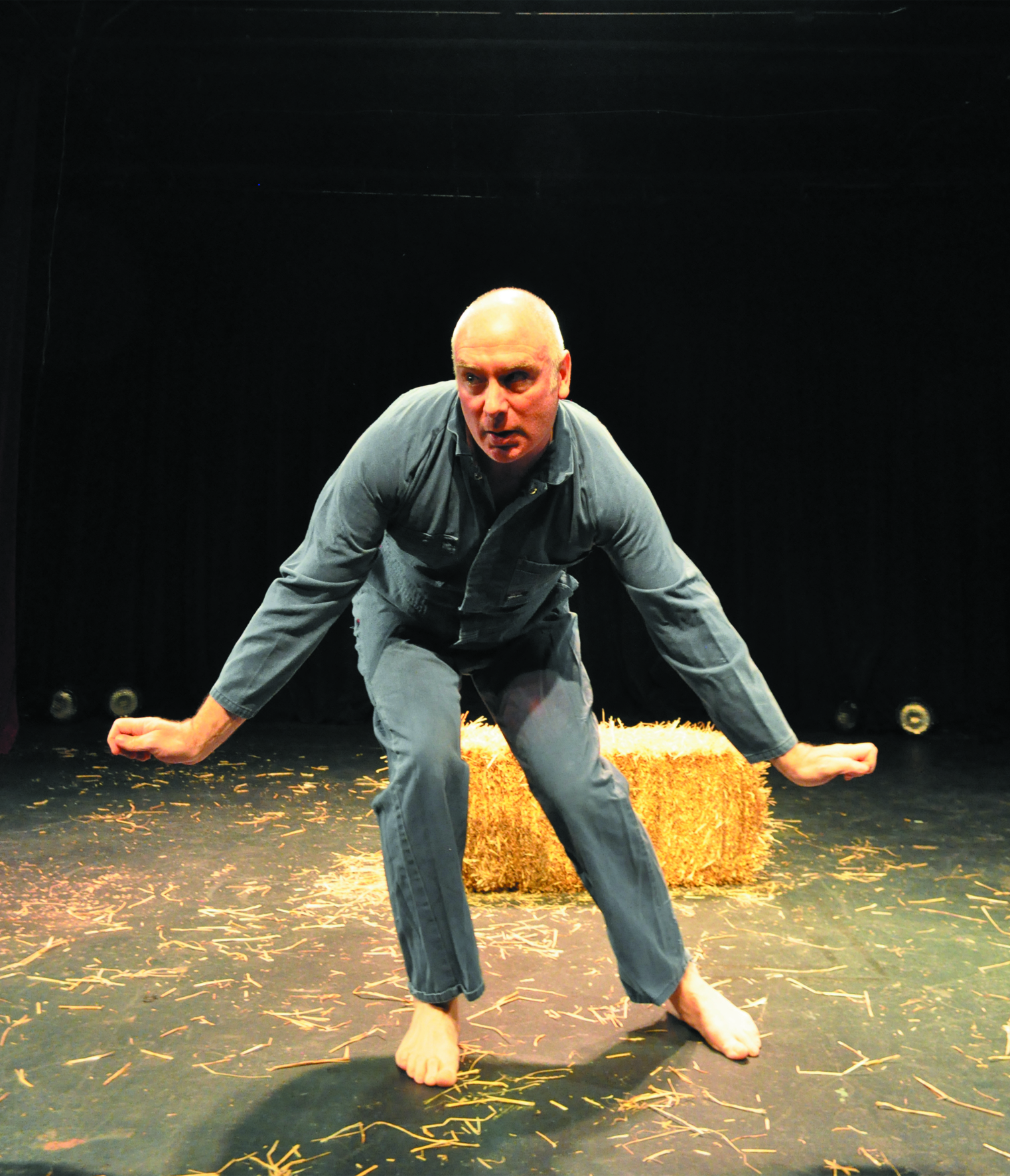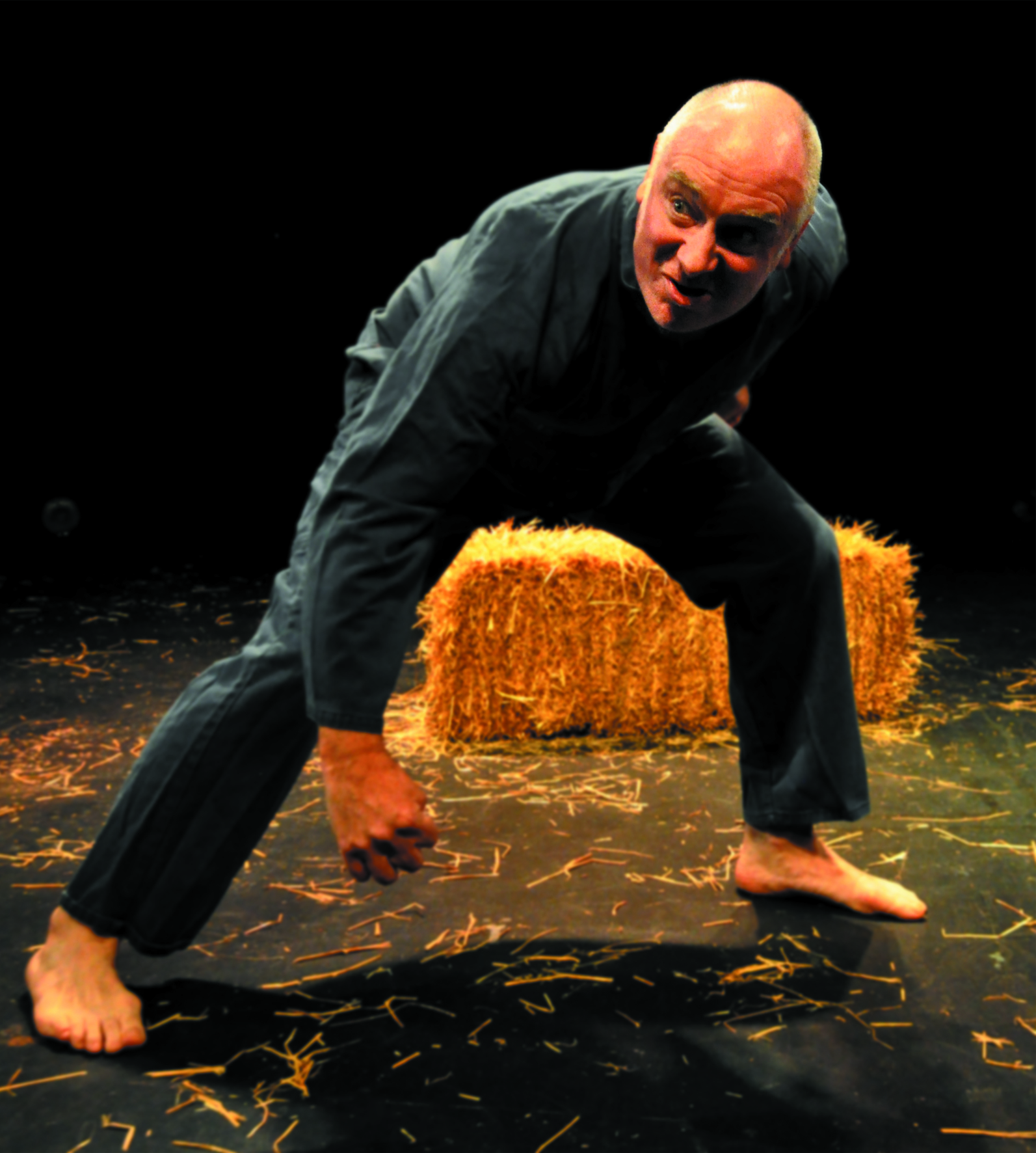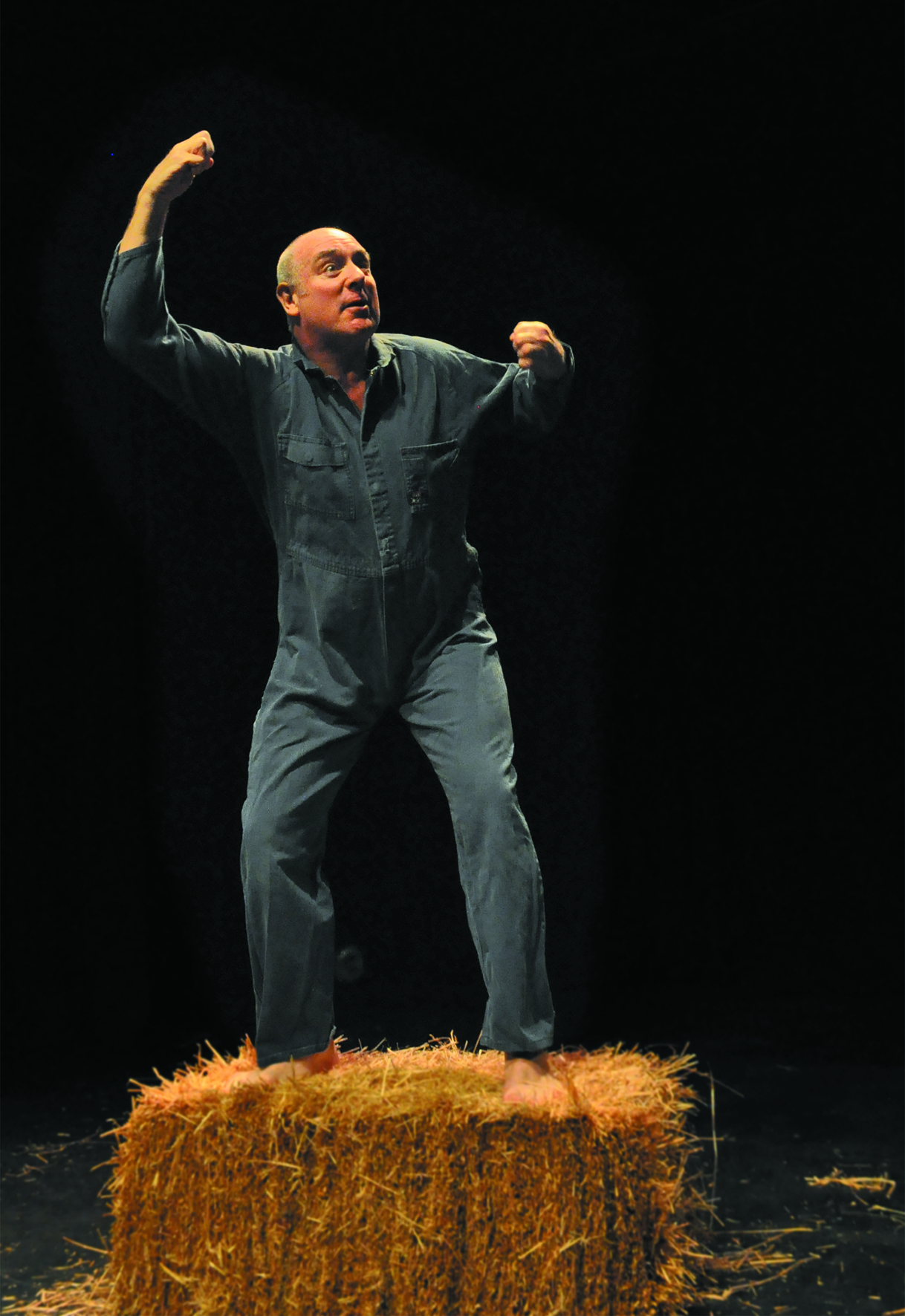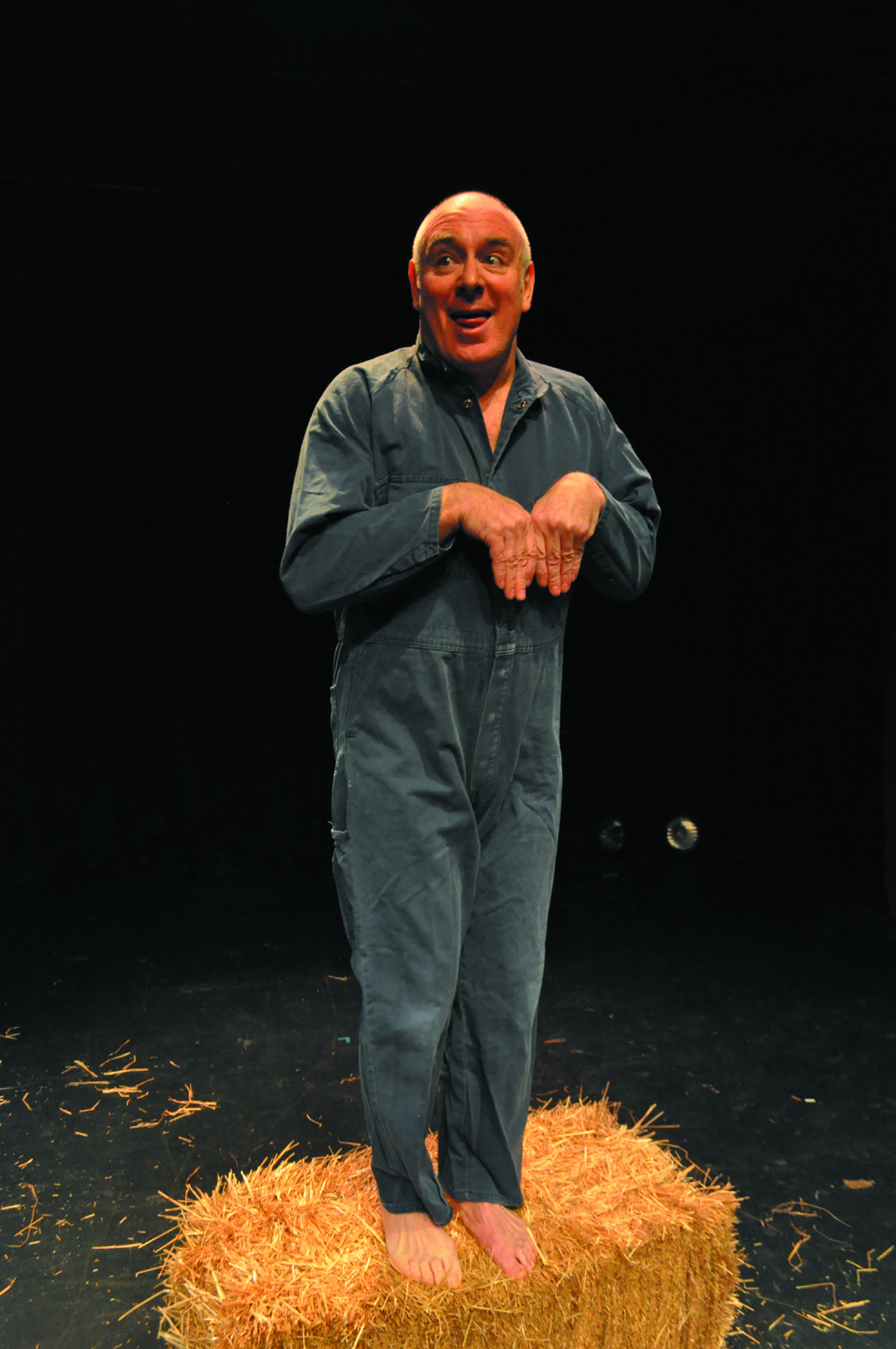 "Guy Masterson skips on to stage barefoot and clad in blue overalls to present his one man adaptation of George Orwell's 1945 classic novel, directed by Tony Boncza. It's bareboards theatre with the only prop a single bale of hay at centre stage. And Masterson certainly fills every inch of the space with his enactment of animal body language. He is at times pig, horse, chicken, cow, bull, sheep donkey, goat and raven. He kicks an invisible shed door open, leaps about the stage in the joy of animal victory, gazes in awe at the luxury of Farmer Jones's house and raises a trotter in triumph and solidarity. He squeezes laughs from the audience as Squealer the pig and amazement as the cartwheeling Boxer and later pathos as the loyal and hardworking old horse grinds to his inevitable and tragic demise.