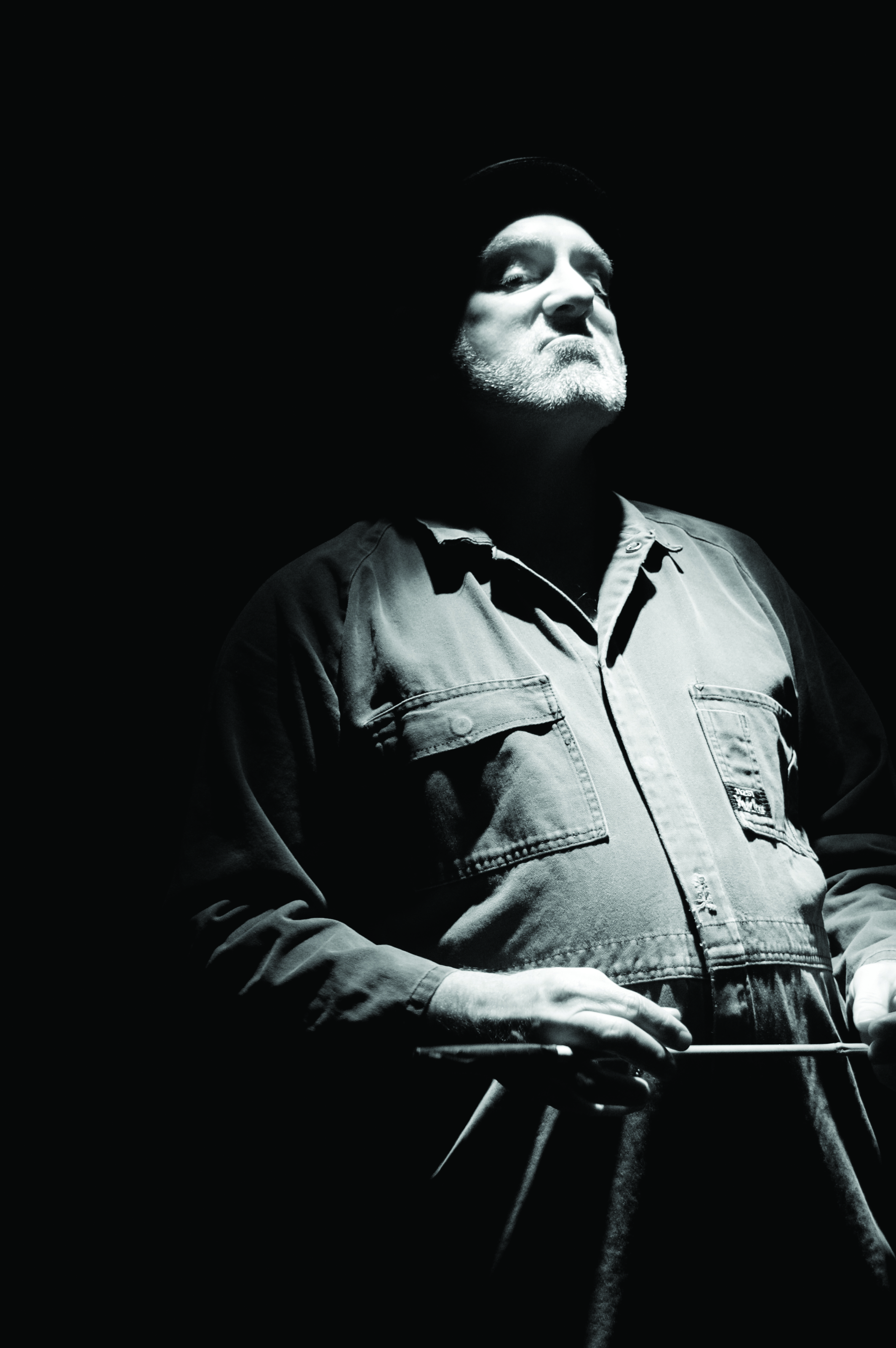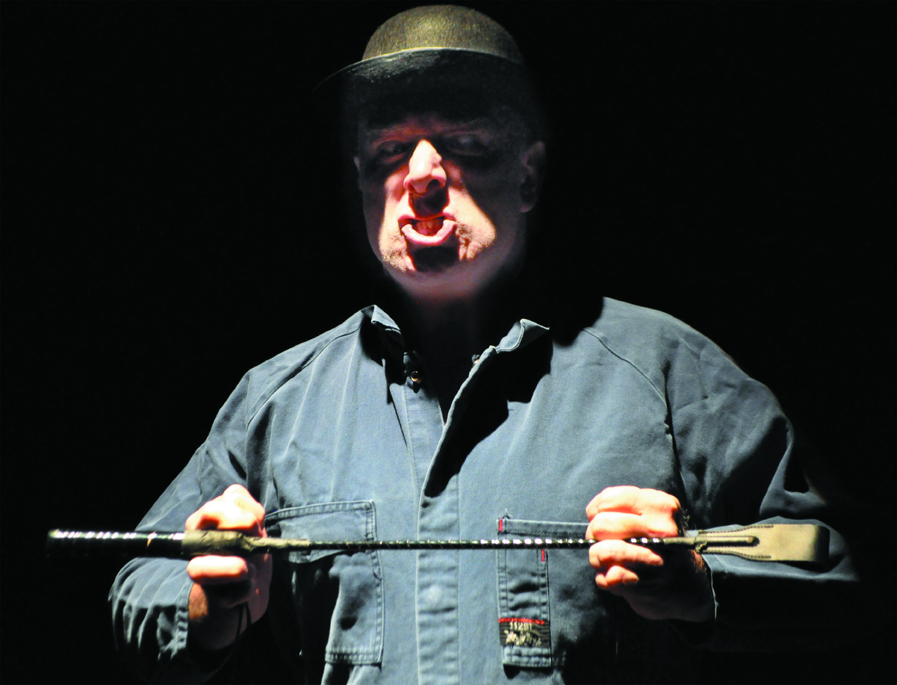 Wearing grey overalls, he arrives to the stage which is empty but for a single wooden trunk. The only other prop is the bowler hat, which will later emerge to depict the pig's adoption of the old master's privileged lifestyle.