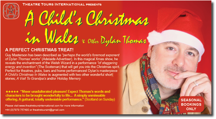 "Once or twice at the Fringe you witness a rarity, an artist's great love and enthusiasm for his favourite subject. Such is the case with Guy Masterson's A Child's Christmas In Wales.. one of those too rare productions at the festival that leaves us so much richer for the experience. Thank you for allowing us to travel in your knowledge of Dylan Thomas, Mr Masterson" (John Ritchie - Edinburgh Guide)